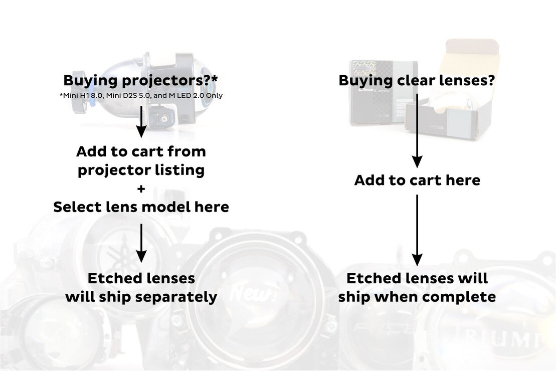Materials: We need something to etch...So if you plan on ordering the etching service, you also need to order a pair of projectors (like STi-R, ZKW-R, etc) along with it. For those of you buying complete projectors, we send the etched lenses separately after a design is chosen and etched.